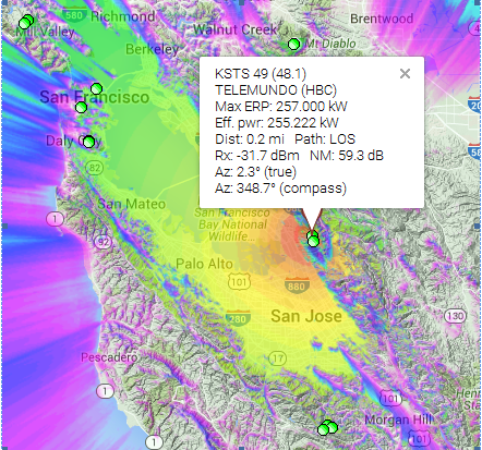 Early on after the digital transition, KGO recognized the problem with VHF and installed a 15 kW UHF 35 translator on Mt Allison that has done a decent job of covering the southern Bay area on over into the Redwood City/Palo Alto area, even back up towards the city of SF. Now that NBC, owner of both KNTV and the Telemundo affiliate KSTS, has added the flagship NBC programming to KSTS, antenna users may be able to get adequate reception from all UHF transmissions without having to gamble on VHF. UHF antenna owners in the city of San Francisco who couldn’t get a reliable VHF signal not have a second chance although will likely need to readjust the aim of their antenna, at a minimum.